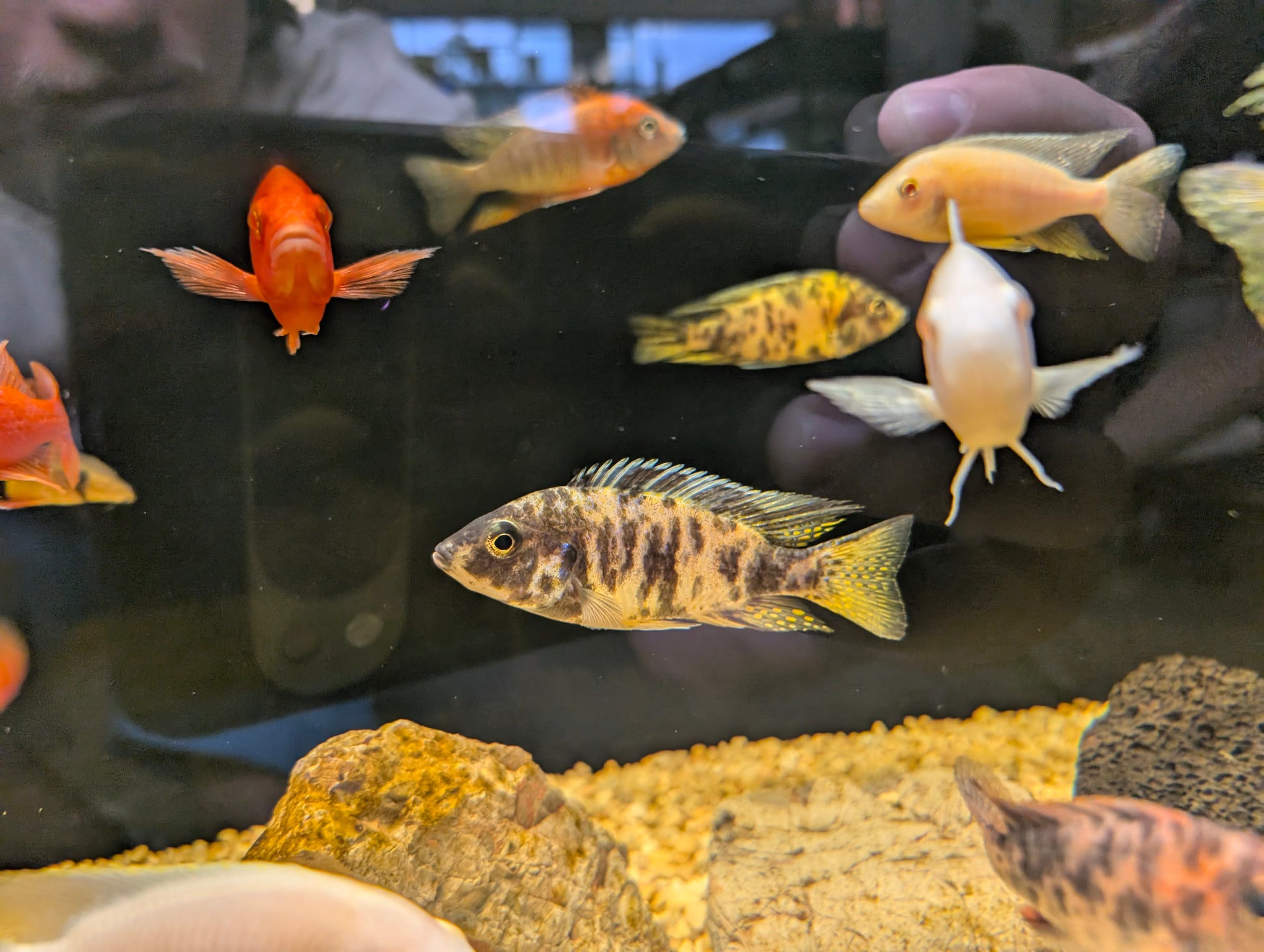 Diet: Fluval Bug Bites Cichlid Formula, Hikari Cichlid Excel, supplemented with spirulina flakes and occasional frozen foods (avoid high-protein/fatty foods to prevent bloat)
