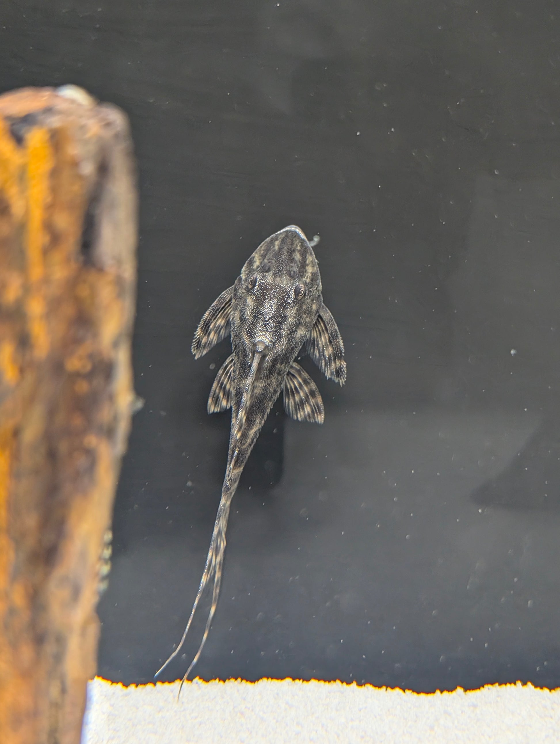 Diet: Driftwood is essential, supplemented with Hikari Algae Wafers, Fluval Bug Bites Pleco Formula, blanched vegetables (zucchini, cucumber), and occasional frozen foods