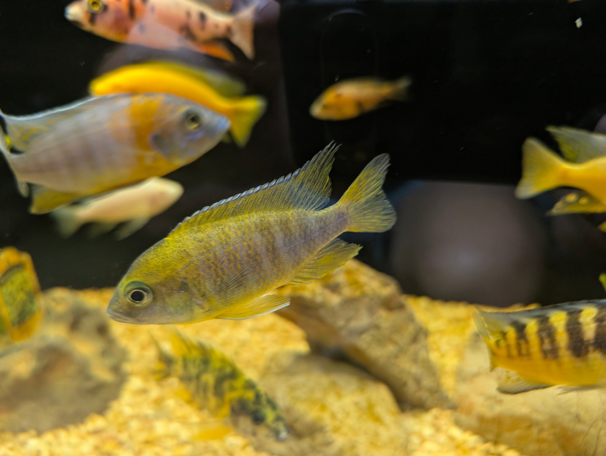 Sunshine Peacock Cichlids are one of the most popular and vibrant Aulonocara varieties, featuring bright yellow bodies with electric blue highlights on the face and fins. These eye-catching fish are peaceful for African cichlids and do well in community setups with other peacocks or haps in hard, alkaline water.